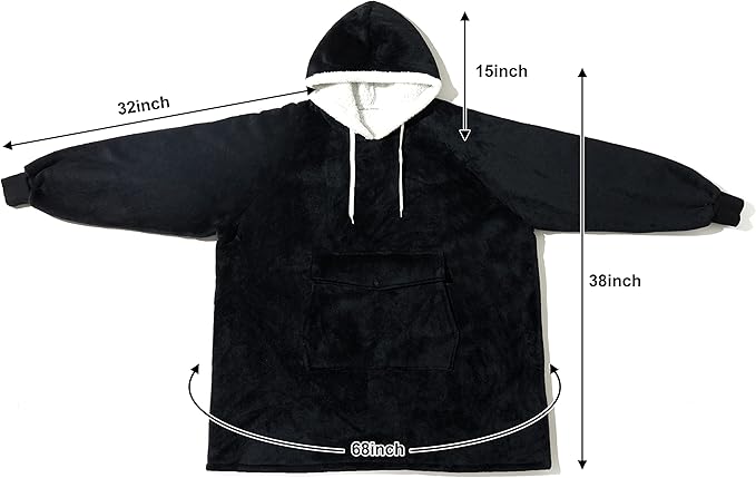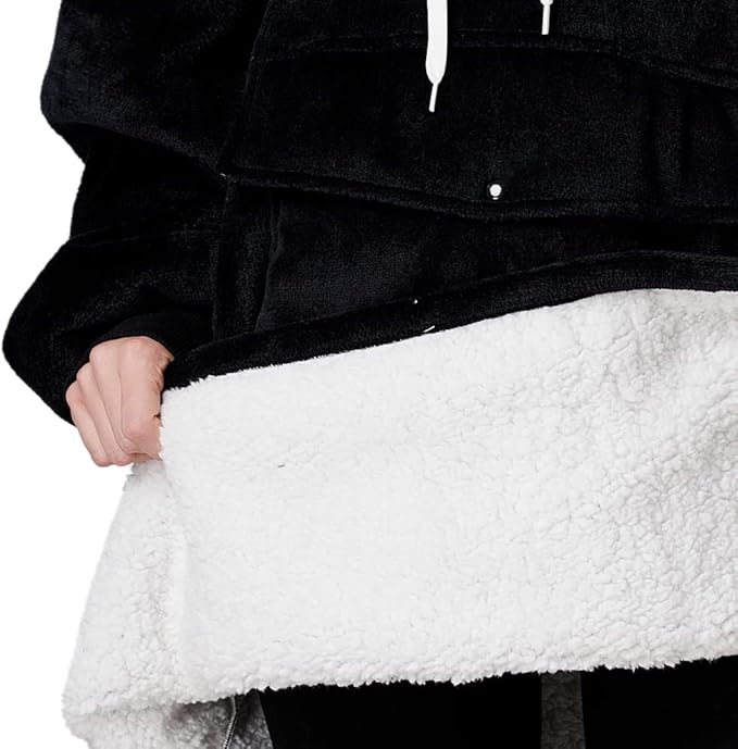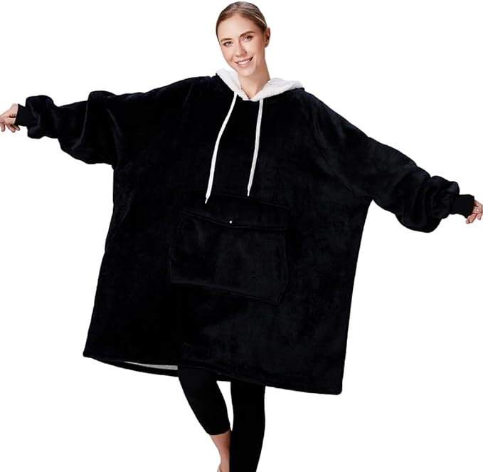 Qeils Oversized Wearable Blanket Hoodie, Comfy Sherpa Sweatshirt Pullover Jacket (Large Pocket, Black, Adult)