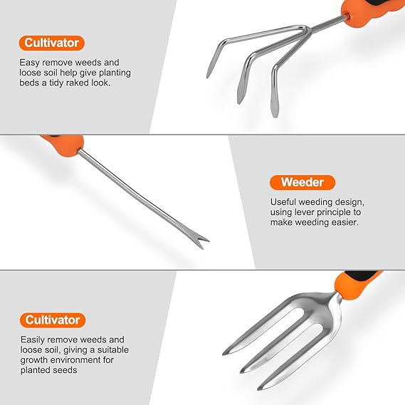 • 【Sturdy and Stainless Steel Garden Set】: Each tool has an ergonomically made soft handle, fashioned from high-quality TRP, that fits comfortably in small and large hands, on top of that, they’re intuitively designed to provide plenty of leverage and save you effort and strain when planting, weeding, and digging. Precisely scaled stainless steel blades that remain sharp for cutting. Sawtooth shovel for easy digging, 2.0 mm thickness, ensuring perfect insertion into the soil.