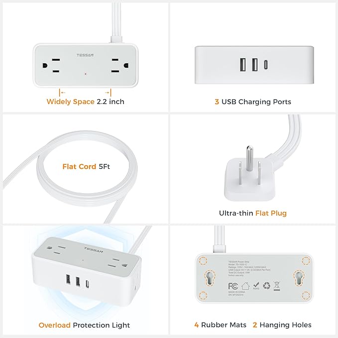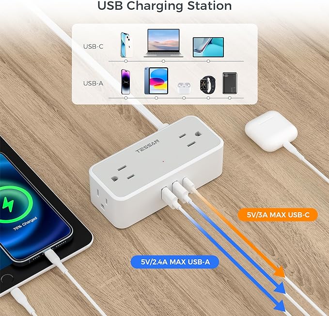 - Power Strip with USB C Ports: This small power strip including 3 USB ports to meet your multiport charging demands, dual USB A ports can charge up to 2.4A per port, and the USB C port can charge up to 3A; Ideal for cell phone, tablet, laptop, earphone, etc