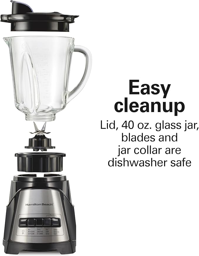 - EASY TO CLEAN WITH DISHWASHER SAFE GLASS JAR, LID AND BLADES: Blending multiple servings is easy with the glass jar that holds 40 ounces; The jar, lid and removable blades on the blender are all dishwasher safe