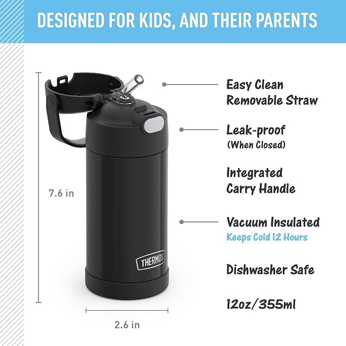 THERMOS FUNTAINER Water Bottle with Straw – 12 Ounce – Kids Stainless Steel Vacuum Insulated Water Bottle with Lid, Black