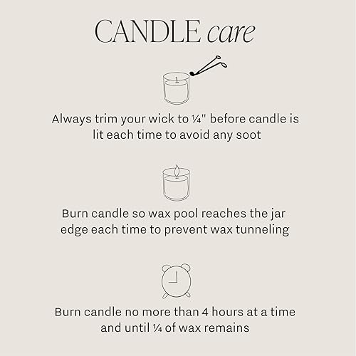 - CANDLE CARE: Trim your wick to 1/4″ before candle is lit each time to prevent soot. Burn candle so wax pool reaches the jar edge each time to prevent wax tunneling. Burn candle no more than 4 hours at a time. Do not burn candle with less than a 1/2″ of wax remaining. Keep candle away from fans, open windows, hot surfaces, children, pets. Never leave a burning candle unattended