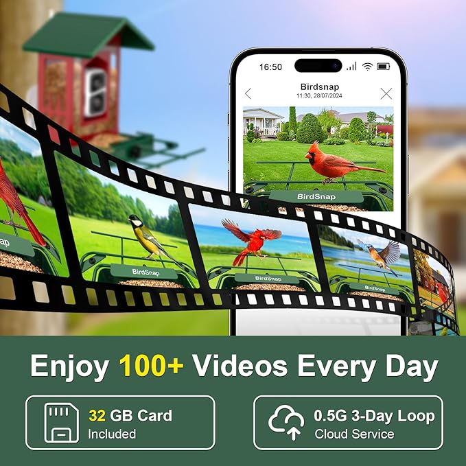 - 【32GB Card Free to Save Videos】We provide a 32GB Storage Card storing more than 20000 10s videos. (Support cloud storage & AI recognition subscription.) Even if there is no network, you can take out the card and export the automatically downloaded videos in it. With a built-in microphone and speaker, you can hear the sound of birds and repel annoying squirrels through the app