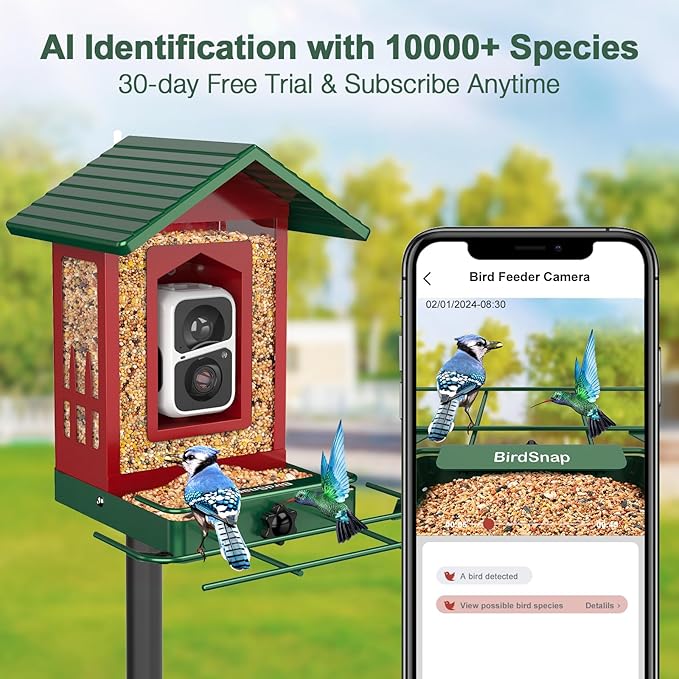 - 【Watch Birds in 1080P Real Time】Equipped with 1080P HD & 160° ultra wide angle camera, the bird feeder camera can auto capture and AI identify 10000+ bird species. You will receive instant notifications and watch birds in full color day and night in real time on APP to ensure you never miss a visit from your feathered friends