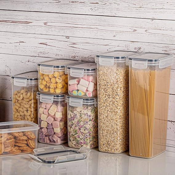 - 4 Size Combinations Fit Your Needs — Our kitchen storage container set comes in 4 different sizes. Includes 6 Tall Container (2.5quart/2.8 liters), 6 Large Containers (1.8quart/2.0 liters), 6 Medium Containers (1.5quart/1.6 liters), 6 Small Containers (0.7quart/0.8 liters). Perfect for storing spaghetti, baking supplies, cereal, flour, sugar, oats, pasta, rice, coffee, tea, snacks, nuts and other dry goods.