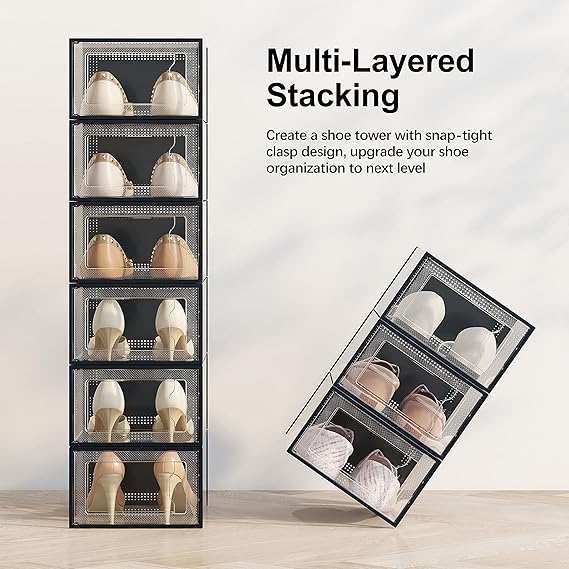 • Say Goodbye to Mess: Stackable shoe storage boxes amazing for dust free and maximizing storage space. Create a shoe tower with snap-tight clasp design, upgrade your shoe organization to next level. Find right shoes through clear front door with a glimpse.