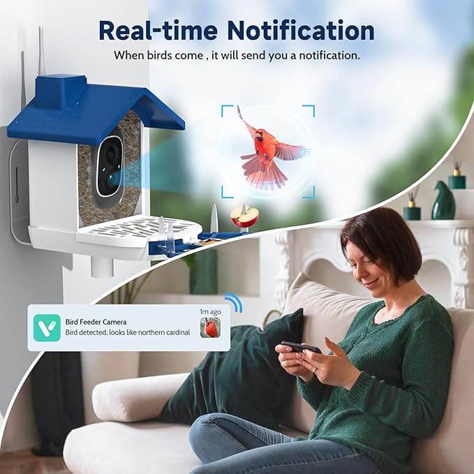 - Smart AI Identify & Motion Detection: This smart bird feeder camera with AI algorithms to automatically identify the species of birds, it can identify over 10,000 bird species and you can easily learn details about each species with the app.