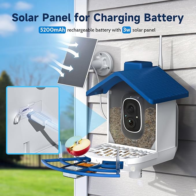 - Solar Panel and Cloud Storage: This bird camera feeder is equipped with a 5200 mah build-in battery and a 3W external solar panel for charging it. Users no longer need to worry about frequent charging of the bird camera caused by multiple people using or frequent wake-up. This smart bird feeder camera allow to watch bird better, it is with cloud storage and intelligent bird recognition technology. Also support multiple phones share with your family or friends.