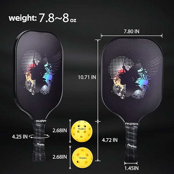• Premium Grip, Perfect Handle Size; Niupipo pickleball paddle is comfortable to handle and works well while in gameplay; USAPA Pro pickleball set is perforated, sweat-absorbent, and cushioned, to allow for a better paddle grip, for longtime play without fatigue; Widebody pickleball paddles shape with 4.72” grip length and 4.25” grip circumference; Paddle Face Dimensions: 10.71″ L x 7.80″ W x 0.42″ T; Total Length 15.43″; Lightweight pickleball paddle 7.83-8oz